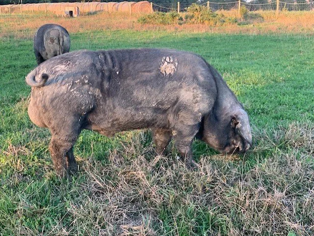 We purchased our first Large Blacks in the summer of 2012. Since then we have been dedicated improving the genetic make up of this breed. We have found that the breed lacked skeletal structure. First and foremost we have been working from the ground up. Getting the pigs to have the proper foundation upon which to build the rest of the hog is paramount. In order to carry more muscle you must have the skeleton there to support it, which will make you more profitable at the market. We are focused on selecting our breeding animals not only for their elite phenotype, but also for their ability to perform at a high level in a variety of production environments. Our focus on selection criteria that emphasizes the animals robust skeletal build and economically important performance traits makes our Boar and Sow inventory unique to Large Black breeders and enthusiasts. We currently have four boar lines and five sow lines which include Defender, Majestic, Malcolm (British) and Super (British) boar lines and Matilda, Daisy, Warbler, Prudence and Charlotte sow lines.